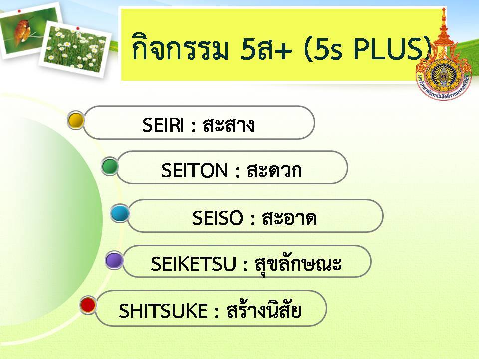 การดำเนินกิจกรรม 5ส. เป็นการสร้างพื้นฐานให้กับพนักงานในการทำงานอย่างมีประสิทธิภาพ มีคุณภาพและสร้างความปลอดภัย รวมถึงการลดอุบัติเหตุที่อาจจะเกิดขึ้นต่องานที่ทำด้วย ซึ่งกิจกรรม 5ส. ประกอบด้วย สะสาง สะดวก สะอาด สุขลักษณะและสร้างนิสัย การดำเนินกิจกรรม 5ส. ไม่ใช่เรื่องยากแต่ต้องให้ พนักงานเข้าใจและเห็นประโยชน์ของการทำกิจกรรม 5ส. ดังนั้นการส่งเสริมและผลักดันให้พนักงานทุกคนมีจิตสำนึก และความตระหนักในการมีส่วนร่วมในกิจกรรม 5ส. จะนำไปสู่ผลลัพธ์ของการดำเนินงานตามนโยบายและเป้าหมาย ที่บริษัทกำหนด และสิ่งสำคัญคือการอบรมให้พนักงานทุกคนทราบขั้นตอนการดำเนินกิจกรรม 5ส. จึงเป็นสิ่งจำเป็น และสำคัญเพื่อให้พนักงานดำเนินกิจกรรมไปในทิศทางเดียวกันก่อให้เกิดเป็นวัฒนธรรมองค์กรที่ดีและทำให้บริษัท ประสบความสำเร็จตามเป้าหมาย และสอดคล้องกับนโยบายการเพิ่มผลผลิตที่สามารถต่อยอดเพื่อสร้างคุณภาพให้แก่องค์กร ไปสู่โครงการอื่นๆ เช่น TPM , TQM , QCC , 7 Waste และกิจกรรมการเพิ่มผลผลิตอื่นๆ ได้อีกด้วย