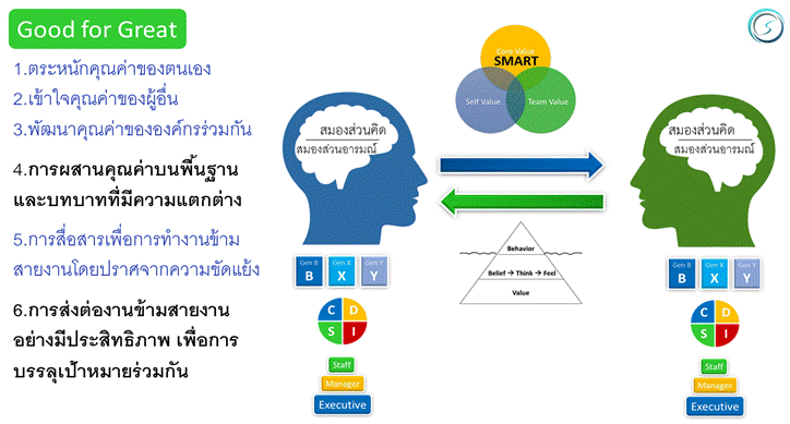 - Synergy Core Value กลยุทธ์การผสานค่านิยมหลักขององค์กร ค่านิยมร่วม/ทีม ค่านิยมส่วนบุคคล เพื่อการทำงานที่สอดคล้องกันสู่การบรรลุเป้าหมายร่วมกัน