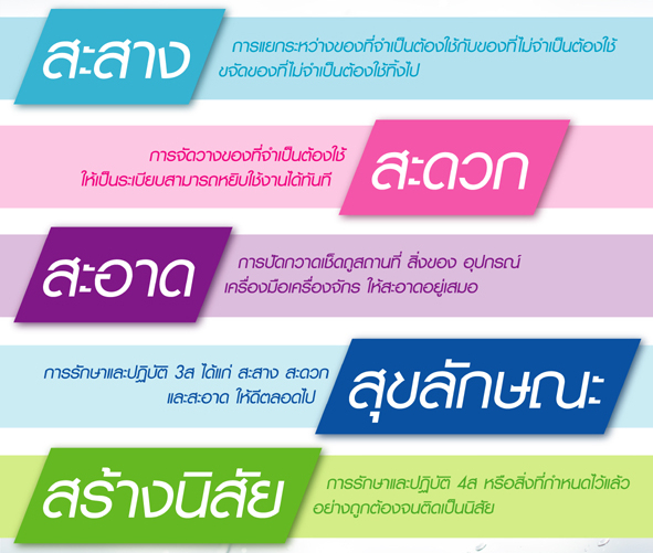 การดำเนินกิจกรรม 5ส. เป็นการสร้างพื้นฐานให้กับพนักงานในการทำงานอย่างมีประสิทธิภาพ มีคุณภาพและสร้างความปลอดภัย รวมถึงการลดอุบัติเหตุที่อาจจะเกิดขึ้นต่องานที่ทำด้วย ซึ่งกิจกรรม 5ส. ประกอบด้วย สะสาง สะดวก สะอาด สุขลักษณะและสร้างนิสัย การดำเนินกิจกรรม 5ส. ไม่ใช่เรื่องยากแต่ต้องให้ พนักงานเข้าใจและเห็นประโยชน์ของการทำกิจกรรม 5ส. ดังนั้นการส่งเสริมและผลักดันให้พนักงานทุกคนมีจิตสำนึก และความตระหนักในการมีส่วนร่วมในกิจกรรม 5ส. จะนำไปสู่ผลลัพธ์ของการดำเนินงานตามนโยบายและเป้าหมาย ที่บริษัทกำหนด และสิ่งสำคัญคือการอบรมให้พนักงานทุกคนทราบขั้นตอนการดำเนินกิจกรรม 5ส. จึงเป็นสิ่งจำเป็น และสำคัญเพื่อให้พนักงานดำเนินกิจกรรมไปในทิศทางเดียวกันก่อให้เกิดเป็นวัฒนธรรมองค์กรที่ดีและทำให้บริษัท ประสบความสำเร็จตามเป้าหมาย และสอดคล้องกับนโยบายการเพิ่มผลผลิตที่สามารถต่อยอดเพื่อสร้างคุณภาพให้แก่องค์กร ไปสู่โครงการอื่นๆ เช่น TPM , TQM , QCC , 7 Waste และกิจกรรมการเพิ่มผลผลิตอื่นๆ ได้อีกด้วย